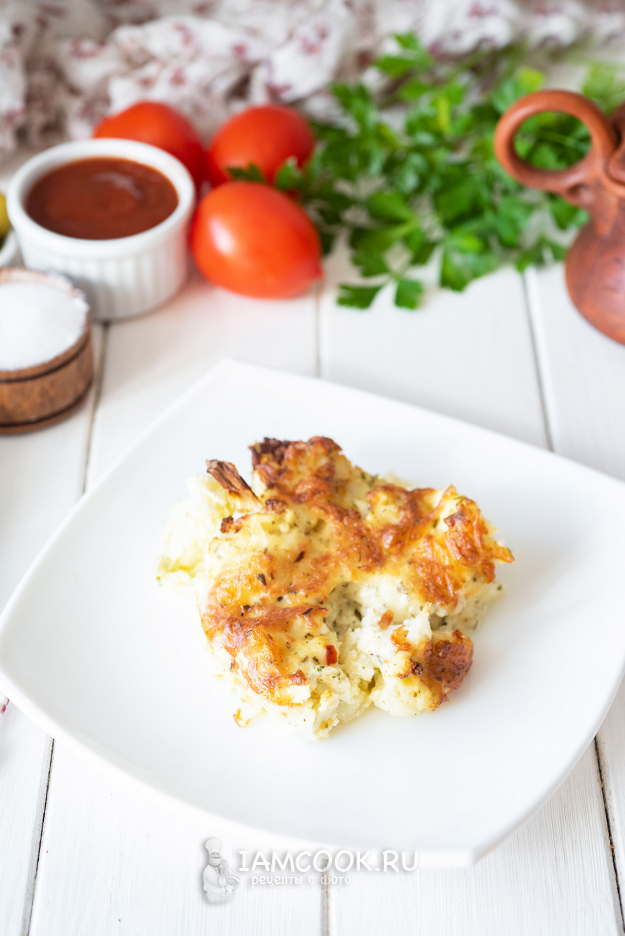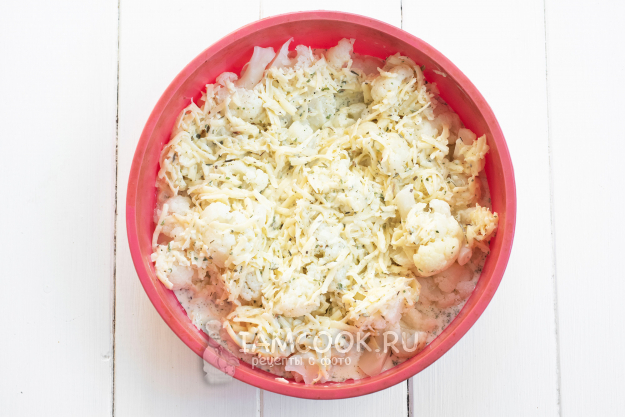 Дно формы для запекания смажем тонким слоем растительного масла, выложим отварные соцветия цветной капусты слоем, поверх распределим сметанно-сырную смесь.