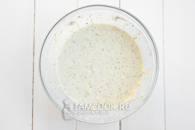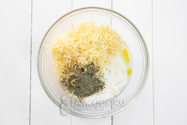 В миску вобьем яйца, добавим сметану, тертый сыр, соль, хмели-сунели.