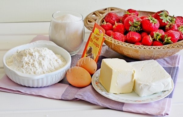 Для приготовления нам понадобится мука, яйца, клубника, сахар, творог обычный, разрыхлитель и ванилин, сливочное масло.