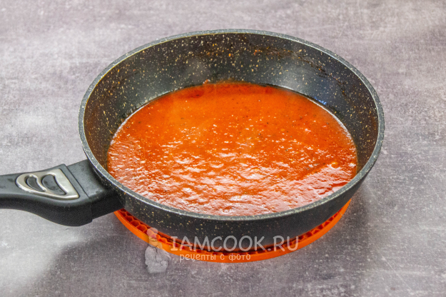 Разогреваем сковороду, вливаем растительное масло и томатную массу.