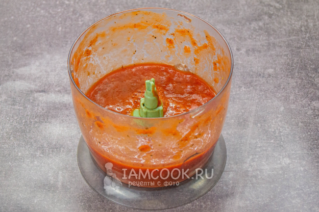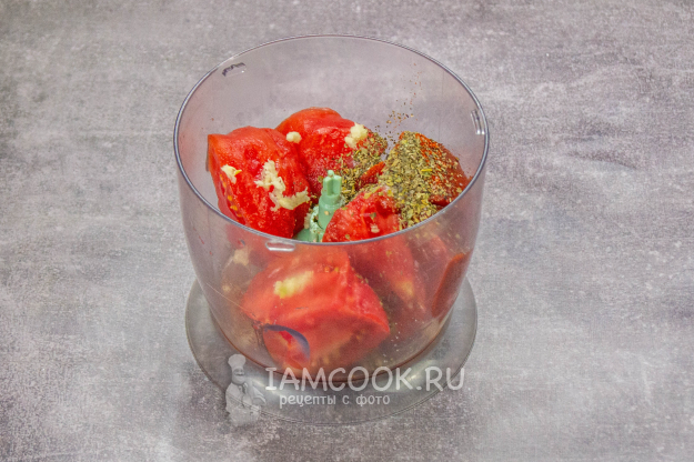 В блендер добавляем томатную пасту, специи, соль, сахар, перец, оливковое масло и чеснок, пропущенный через пресс.