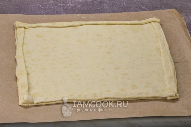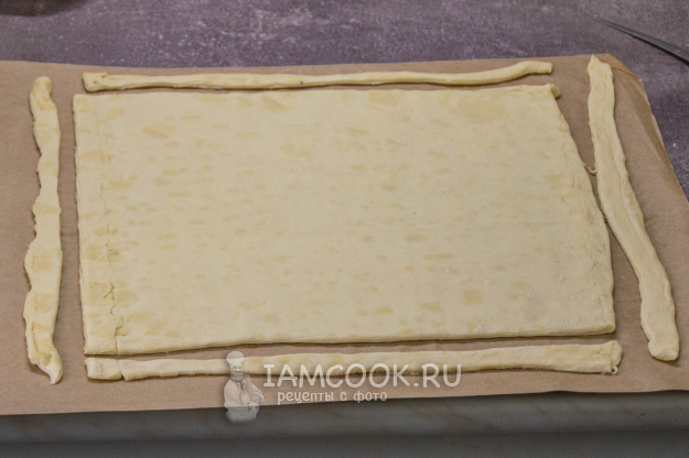 Слоеное тесто раскатываем, отрезаем полоски по краям. Полоски старайтесь делать небольшими, около 1 см в ширину.