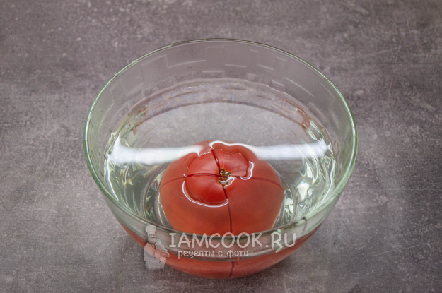 Приготовим соус. На помидоре делаем крестообразный надрез и заливаем крутым кипятком.