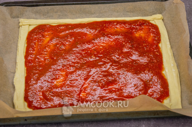 На тесто выкладываем соус и распределяем по всей поверхности.