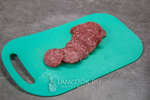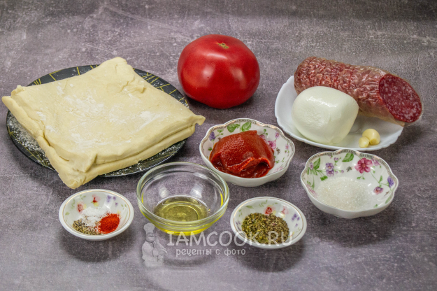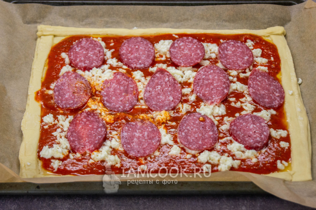 Соберите ингредиенты для приготовления пиццы пепперони на слоеном тесте.