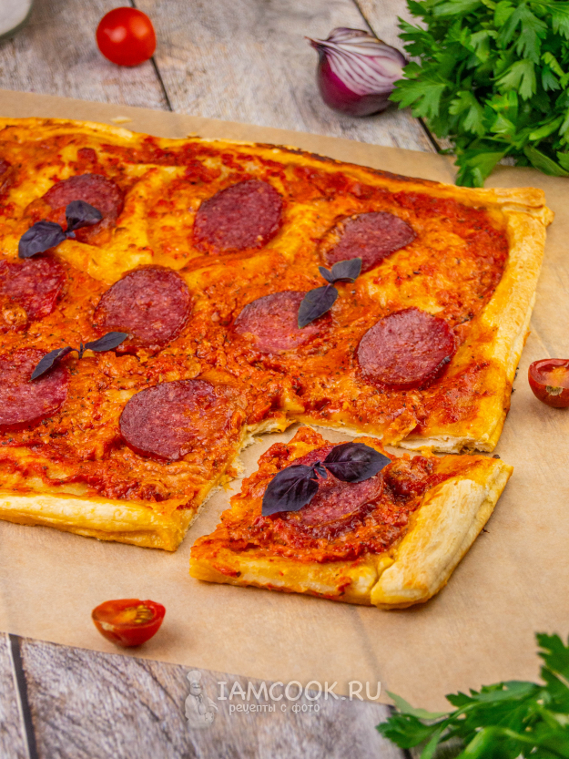 Пицца пепперони на слоеном тесте готова! Нарезайте и подавайте еще горячей. Приятного аппетита!
