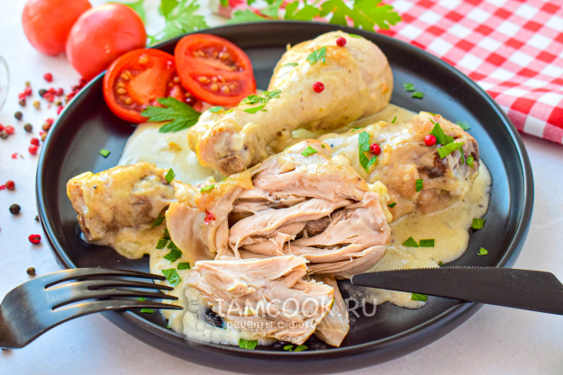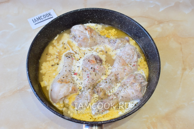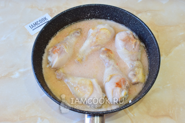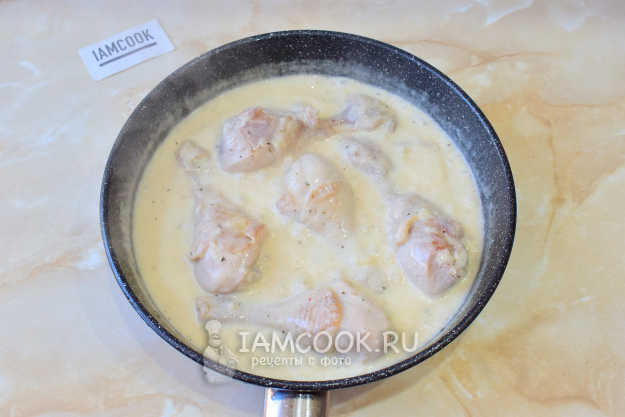Доведите куриные ножки в сливочном соусе на сковороде до кипения и снимите с огня.