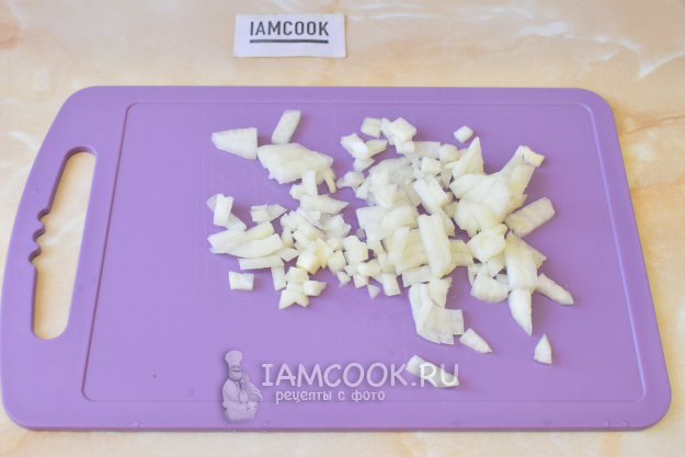 Отправьте лук к курице и обжарьте его 1-2 минуты до появления характерного аромата.
