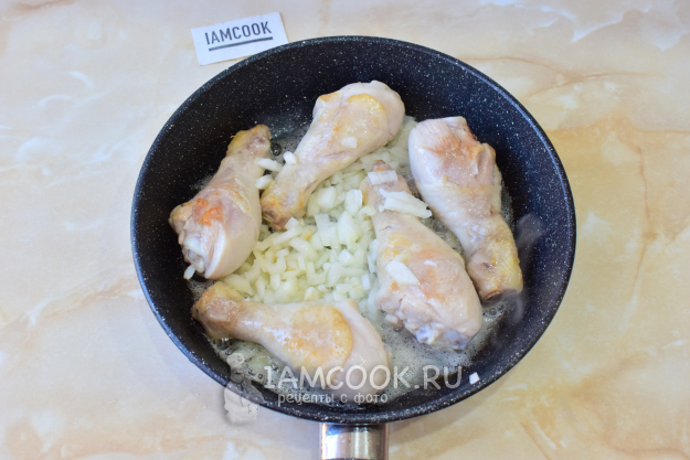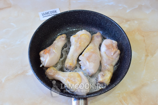 Разогрейте сковороду до горячего состояния. Налейте растительное масло. Обжарьте куриные голени 8-10 минут до легкого подрумянивания.