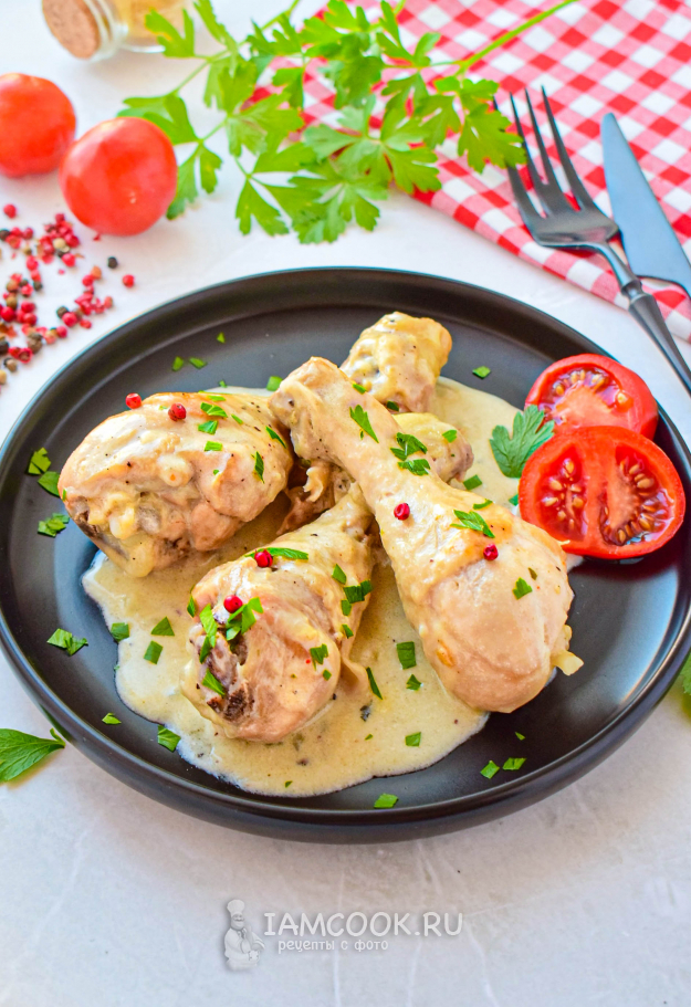 Чтобы приготовить куриные ножки в сливочном соусе на сковороде, соберите необходимые ингредиенты по списку. Сливки можно брать любой жирности. Чем выше жирность сливок, тем более сливочный будет вкус готового блюда.