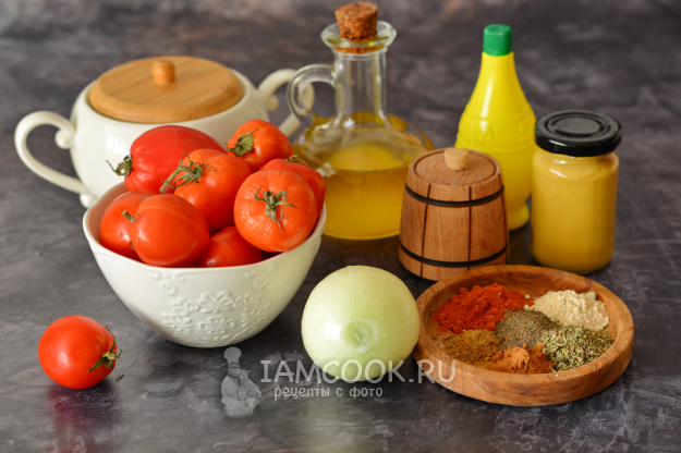 Соберите все необходимые продукты для приготовления кетчупа из помидоров с горчицей на зиму.