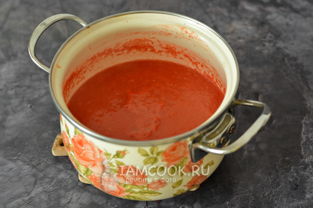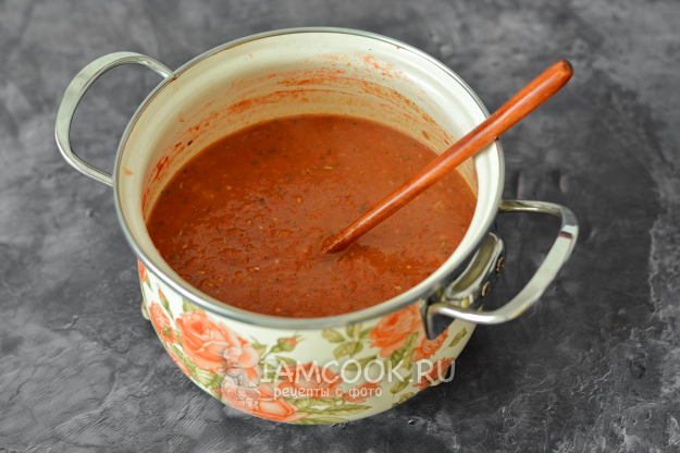 Поставьте томатную массу на плиту, при помешивании доведите до кипения и варите на среднем огне 30 минут. Обязательно накройте кастрюлю крышкой, так как томат любит "плеваться". И периодически помешивайте содержимое лопаточкой до самого дна.