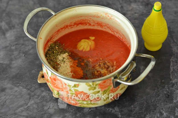 В томатное пюре добавьте жареный лук, горчицу, соль, сахар и все специи. Добавьте лимонный сок.