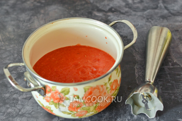 Помидоры нарежьте произвольно и измельчите в пюре при помощи погружного блендера прям в кастрюле, в которой будете варить кетчуп.