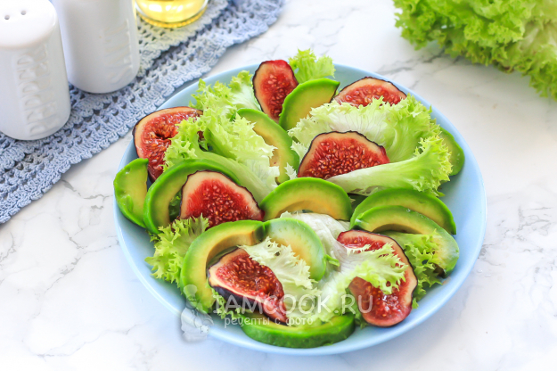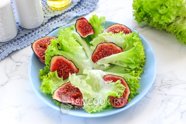 Промойте инжир, срежьте хвостики и нарежьте слайсами, брусочками или кубиками - по желанию. Выложите между листьями салата.