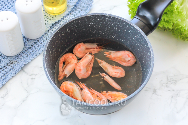 Вскипятите воду в чайнике или ковше и выложите туда креветки. Оставьте на 3-5 минут и потом очистите их от панцирей. Если креветки крупные, то обязательно очистите и их пищевод.