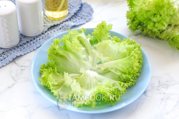 Промойте листья салата, срежьте стебли и стряхните лишнюю влагу. Выложите на тарелку.