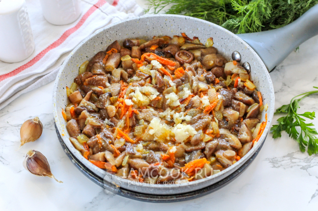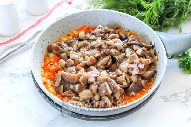 В это время нарежьте промытые в холодной воде и отжатые маслята средними или мелкими кубиками. Кстати, совсем мелкие грибы можно и не нарезать. Добавьте на сковороду и перемешайте. Потушите примерно 3-4 минуты.
