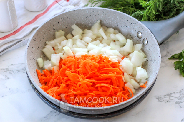 Очистите лук и морковь от кожуры, промойте в воде. Нарежьте лук мелким кубиком, а морковь натрите на терке с крупными ячейками. Икра - это не паштет и мельчить ингредиенты для ее приготовления не нужно. Они должны быть нарезаны средними или мелкими кубиками, кусочками и т.д. Прогрейте на сковороде растительное масло и выложите в него овощные нарезки. Обжарьте 3-5 минут до румяности.