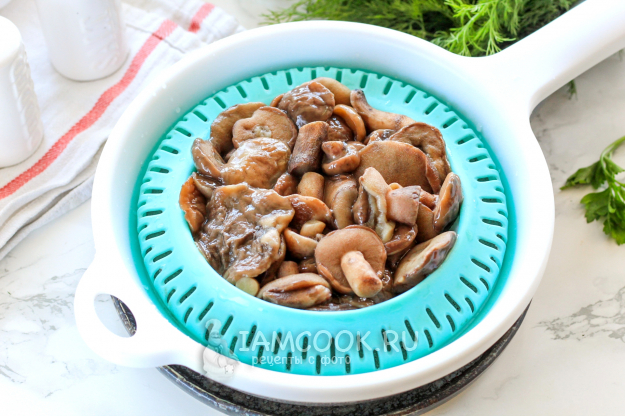 После чего грибы откиньте на дуршлаг и промойте. В кастрюлю обратно выложите маслята и залейте кипяток, отварите еще 10 минут. Можно добавить лавровые листья или горошины душистого перца, но потом их нужно будет удалить!
