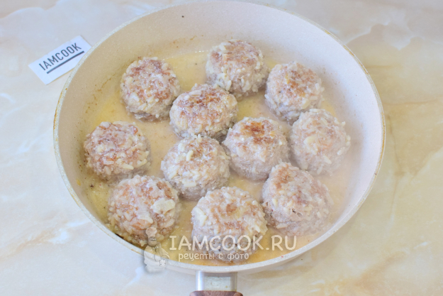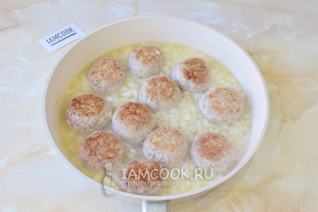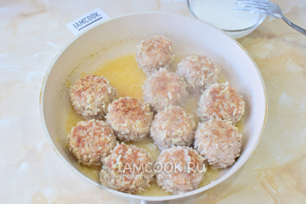 Добавьте в сковороду горячую воду на половину мясных шариков. Под крышкой доведите до кипения. Тушите на малом огне 15-20 минут. Рис будет впитывать в себя воду и увеличиваться в размере. Если воды станет мало, а рисинки еще твердые, то можно добавить еще немного.