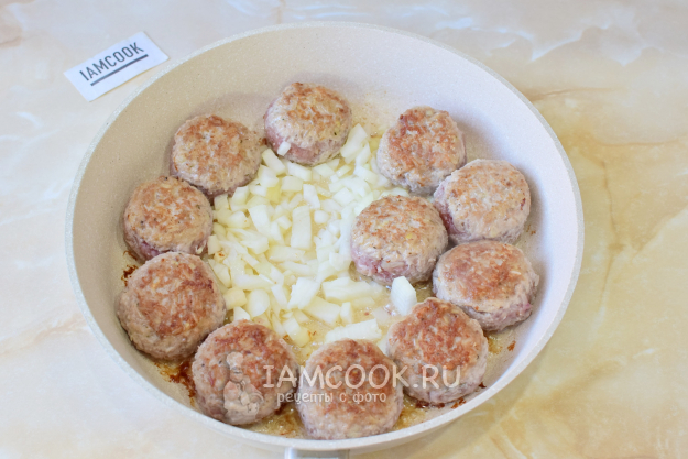 Обжарьте их со всех сторон. Затем добавьте мелко нарезанный лук. Обжарьте лук 1-2 минуты до появления характерного аромата.