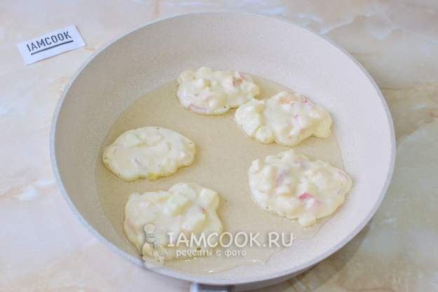 На сковороду влейте масло без запаха и выкладывайте ложкой яблочное тесто. Огонь сделайте минимальный, чтобы оладьи с яблоками на сыворотке пропеклись внутри и не подгорели снаружи.