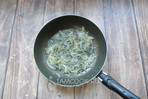 Репчатый лук очистите, помойте и нарежьте полукольцами. Выложите в сковороду с небольшим количеством растительного масла. Слегка поджарьте в течение нескольких минут. Налейте немного бульона из кастрюли и прогревайте в нем лук еще несколько минут.