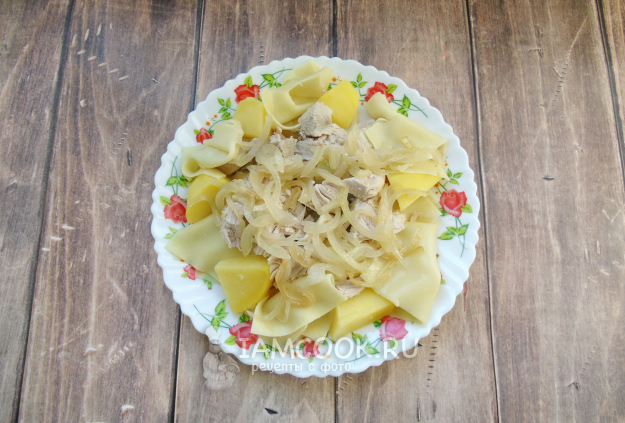 Сверху разложите лук, томленный в бульоне.