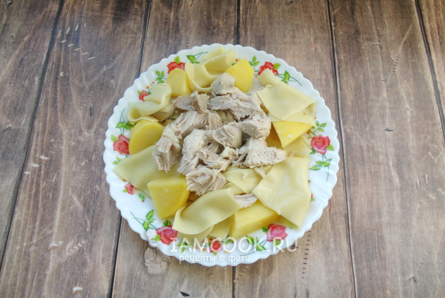 Картошку очистите, помойте и сварите в подсоленном бульоне. На большую тарелку выложите лапшу и картошку. Свинину нарежьте небольшими кусочками и разложите на лапше с картошкой.