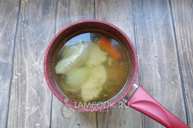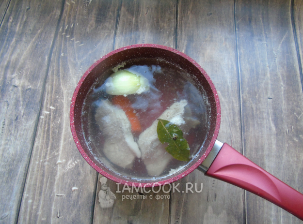 Доведите до кипения. Огонь убавьте и снимите пену. Добавьте лавровый лист, соль, лук и любые коренья.