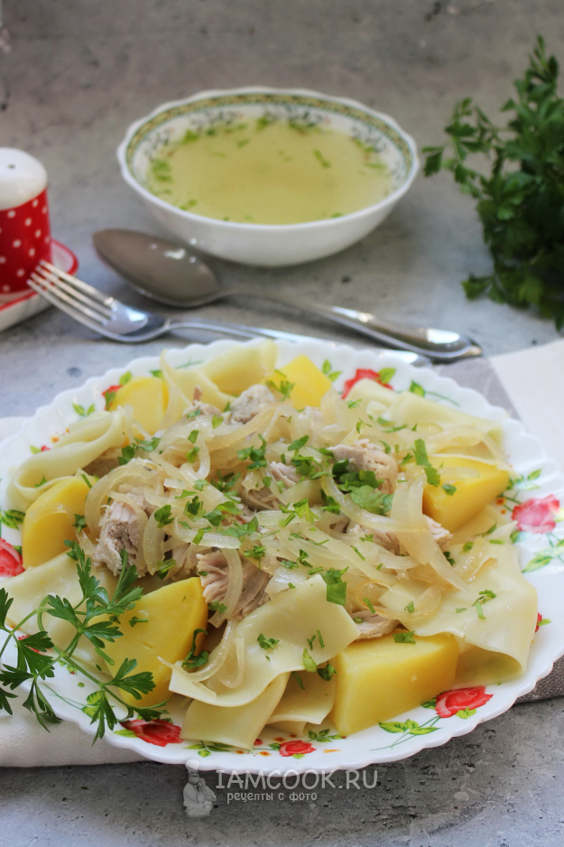 Бешбармак из свинины с картошкой готов. Посыпьте блюдо зеленью и подавайте к столу. Отдельно в мисочку или пиалу налейте бульон.
