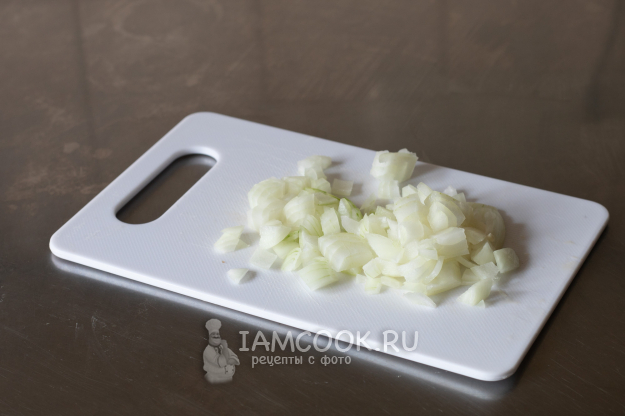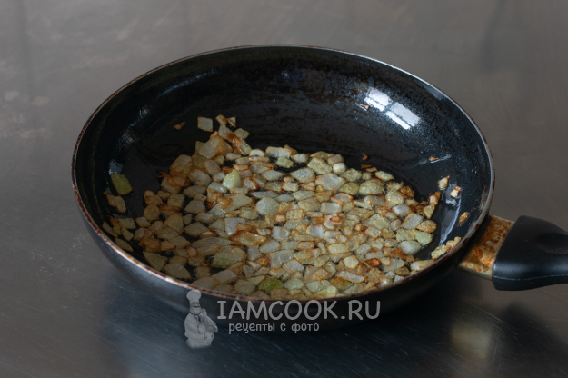 Обжариваем сначала на сильном, а потом (когда зазолотится) на слабом огне лук около 5 минут, до лёгкой коричневатости.