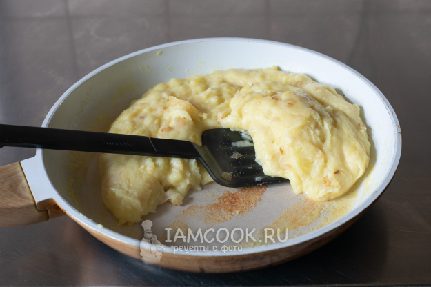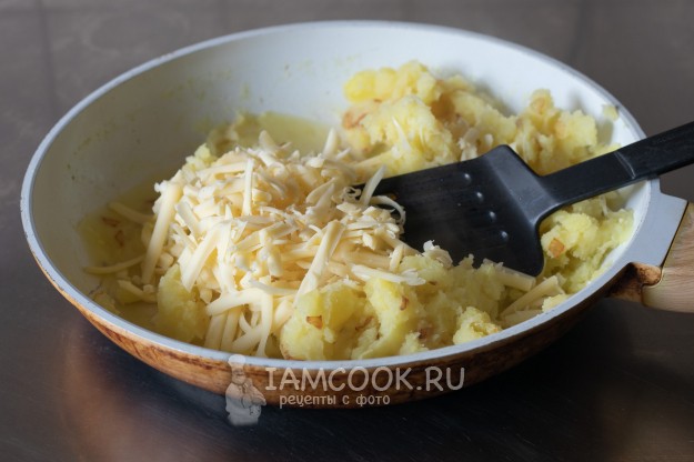 Вмешиваем к толчёной картошке с луком сыр. Если чувствуется, что масса пригорает к сковороде - добавляем ещё немного растительного масла.