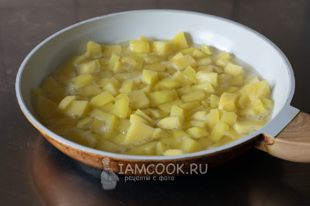 Смотрим, чтобы картошка была полностью покрыта водой (если не хватило налитой изначально, доливаем ещё), закрываем крышку и варим на среднем огне 10 минут. На последних двух минутах начинаем промешивать картошку, вода к тому моменту должна будет почти выпариться.