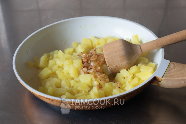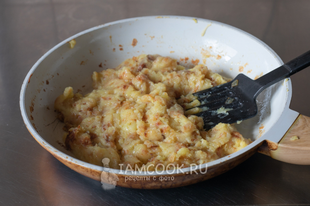 Скорее всего, картошка и лук будут готовы одновременно. Если нет, то выключаем одно и доводим до готовности другое. А потом соединяем их вместе на большой сковороде и толчём картофельной толкушкой до достижения достаточной гомогенности. Не совсем в пюре, немного кусочков может остаться. Делать это можно на плите, на слабом огне.