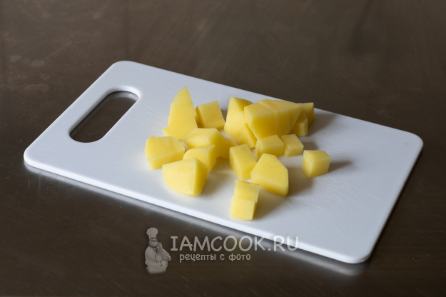 Режем картошку мелкими кубиками и закладываем её по мере нарезки в закипающую воду.