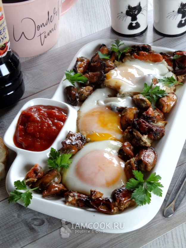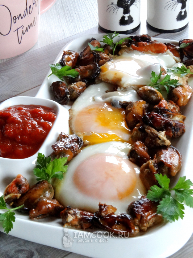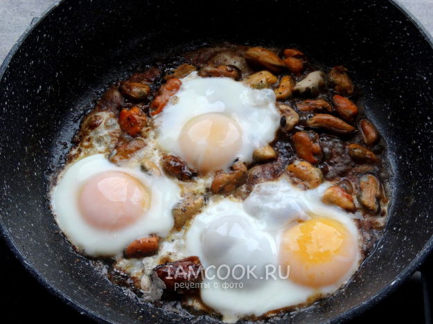 Заменив колбасные изделия таким морепродуктом, вы останетесь только в выигрыше, а ещё и под приятным впечатлением. Питательный завтрак можно готовить из разного количества яиц, а также яичницу вы можете сделать по своему вкусу: с жидким желтком или нет - решать вам)).