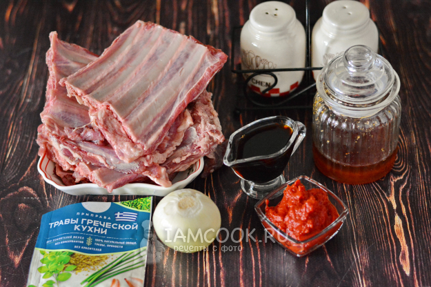 Соберите все продукты по списку для приготовления тушеных бараньих ребрышек в мультиварке.