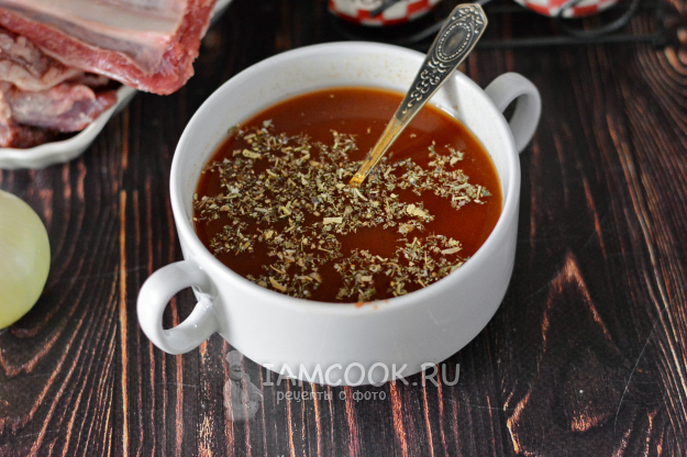 Для соуса соедините в мисочке томатную пасту, мёд, соевый соус, соль и разведите водой, всыпьте сухие травы.