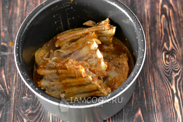 Бараньи рёбрышки сложите в чашу мультиварки, добавьте нарезанный полукольцами лук и влейте соус.