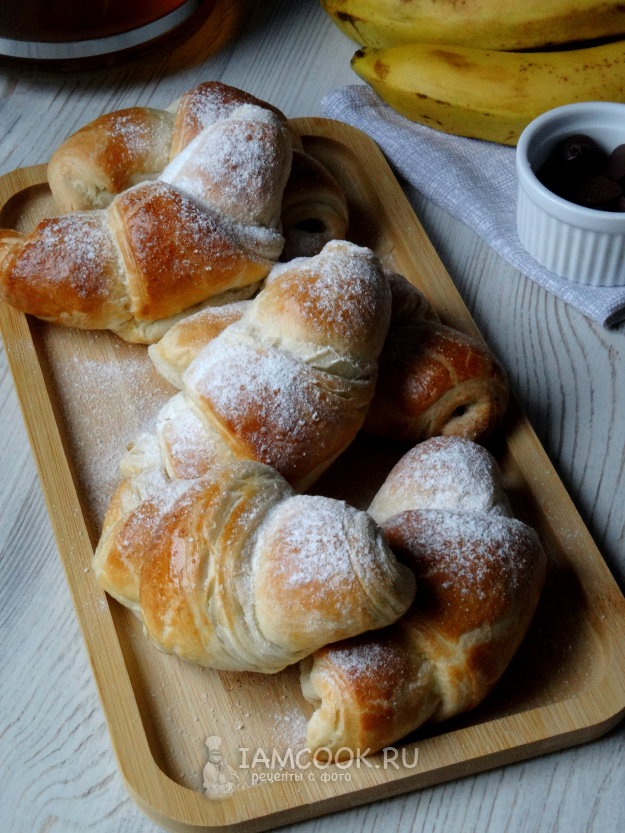 Круассаны с бананом и шоколадом подавать в тёплом виде.