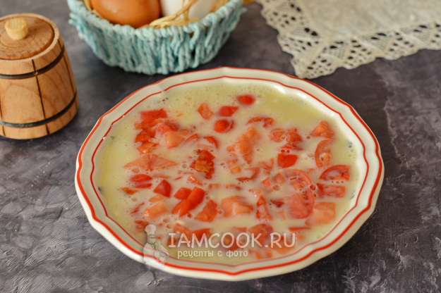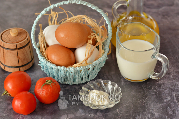Продукты для приготовления пышного омлета с помидорами на сковороде - перед вами.