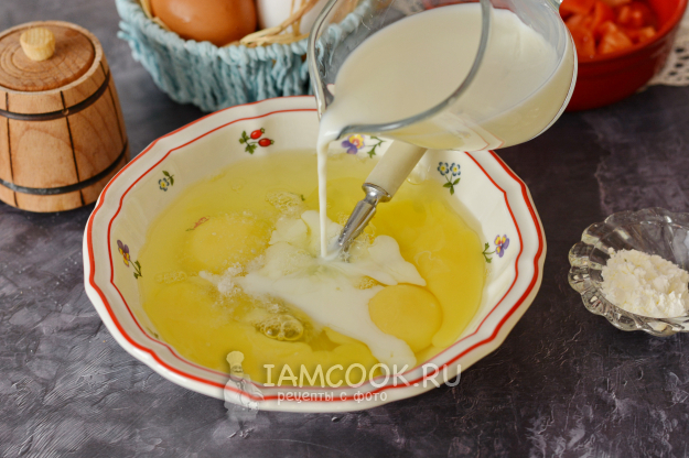 Вбейте в миску яйца, добавьте щепотку соли. В молоке размешайте крахмал и влейте к яйцам.