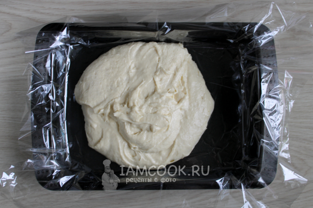 Полученное мягкое липкое тесто распределите по форме, проложенной пакетом для запекания. Удобно это выполнить влажными руками или силиконовой лопаткой.