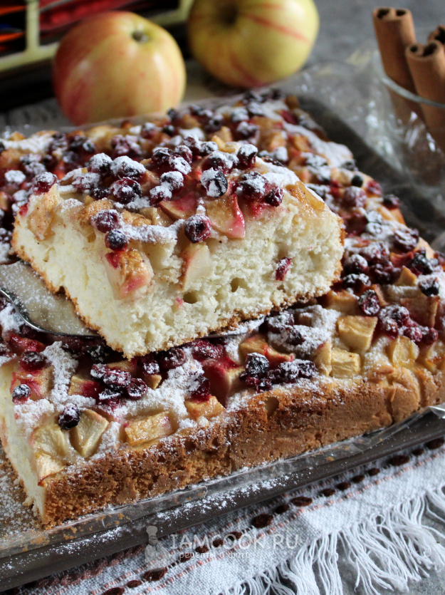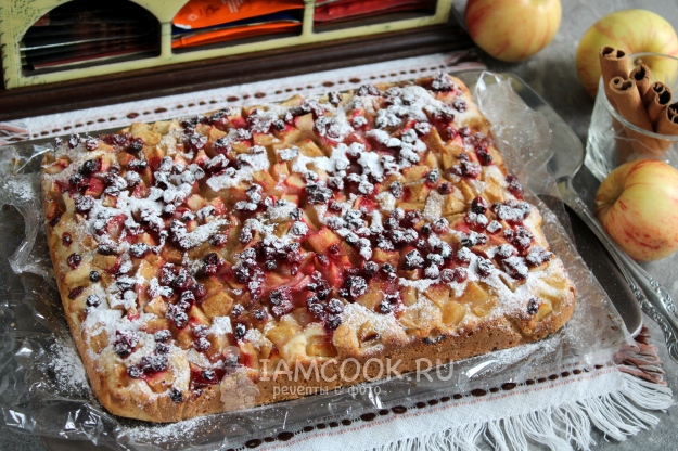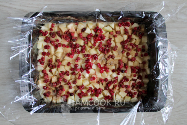 Сверху яблочной начинки ещё добавьте замороженные ягоды и посыпьте второй частью смеси из корицы и сахара.