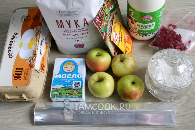 Для приготовления пирога в рукаве (пакете для запекания) соберите ингредиенты по списку к рецепту. Вместо замороженных ягод брусники в сезон берите какие-либо свежие или замените вареньем по вкусу.