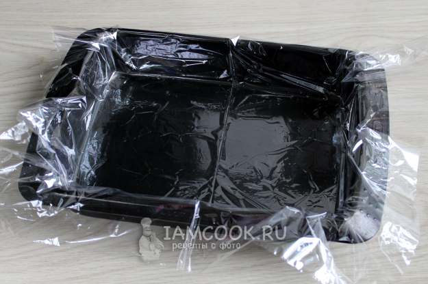 Пакет для запекания бывает обычно в виде рукава, который нужно отмерить и разрезать, придав прямоугольную форму. Нужно прикинуть, сколько пленки понадобится, чтобы укрыть ею форму, и пусть ещё останется свободная часть, за которую будет удобно извлекать готовый пирог.