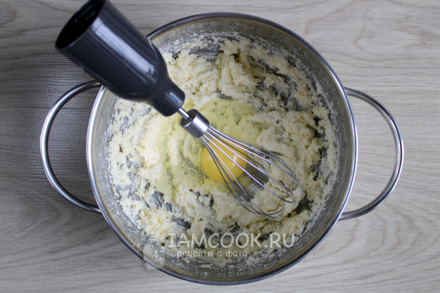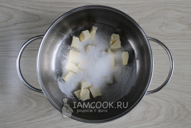 Для теста нужно нарезать сливочное масло на кусочки и оставить на время до получаса, чтобы оно размягчилось при комнатной температуре. Затем добавьте сахар и перетрите.