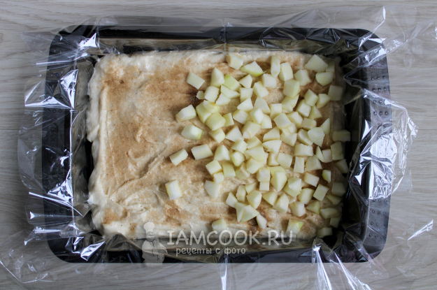 Смешайте корицу с сахаром и половиной этой смеси посыпьте тесто. Нарежьте яблоко кубиками, равномерно распределите их по поверхности теста.
